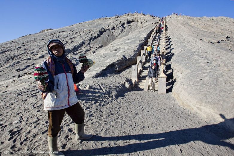 Вид с верхушки Бромо на гору Баток и беспрерывный поток туристов, восходящих по лестнице на вулкан: