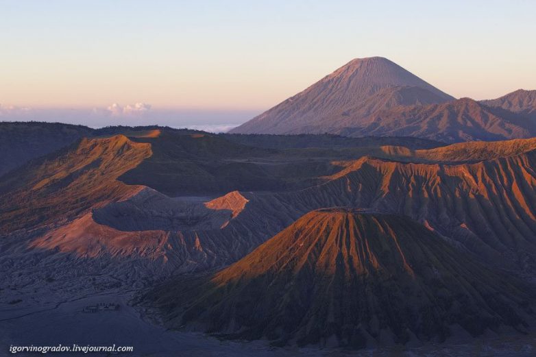 На заднем плане гора Семеру, которая является самым высоким и активным вулканом на острове Ява. Стратовулкан также известен как Махамеру, что означает «Великая гора», обитель богов. На переднем плане гора Баток и левее Бромо (низенький), а за ним Курси. Вершину Бромо разрушило извержением много лет назад.