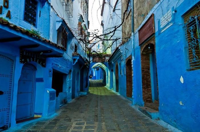 В северной части Марокко расположился город Шефшауен, который известен всему миру не только памятниками архитектуры или необычным ландшафтом. Популярность среди туристов он сыскал благодаря необычному цвету домов на одной из улиц. Здания, окрашенные в яркие лазурные цвета, визуально сливаются с небом и производят сильное впечатление на туристов. Голубые дома здесь стали появляться в тридцатых годах прошлого столетия благодаря еврейским беженцам. Они перекрашивали свои жилища в цвет неба, что символизировало рай и единение с Богом. Коренному же населению идея с такими яркими домами понравилась еще и потому, что яркий голубой цвет якобы отпугивает комаров, потому и они продолжили эту странную традицию.