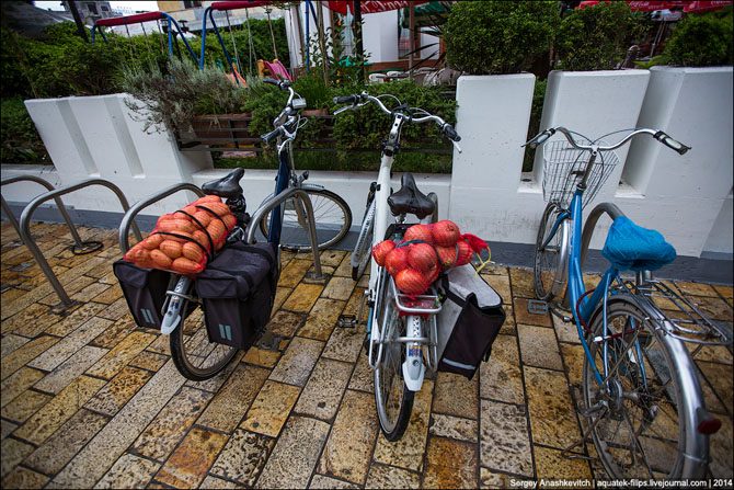 Это велопарковка около довольно крупного ресторана. Приехал человек на Гелике велосипеде с луком, зашел в ресторан, выпил чашечку кофе, и дальше неспешно покатил.
