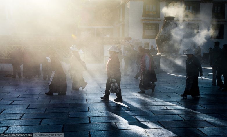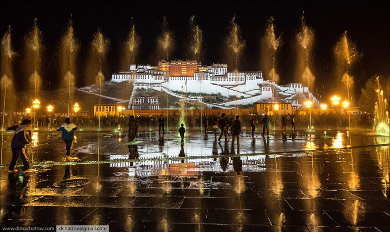 Фонтаны перед сердцем Лхасы — Поталой. Первые постройки на месте дворца датируются VII веком, позже он неоднократно перестраивался и на сегодняшний день включает более 2000 комнат. Дворец на протяжении многих веков служил резиденцией и храмом Далай-ламы: