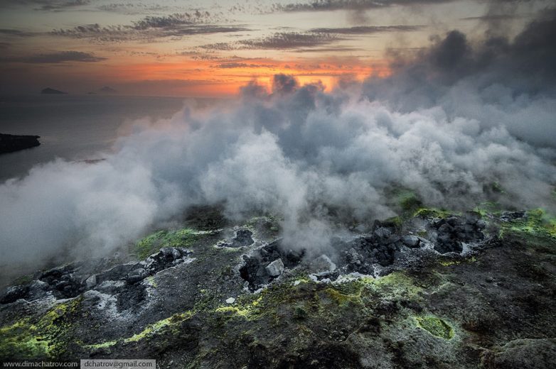 Фумаролы острова Вулкано — крохотного вулканического островка в Тирренском море, расположенного в 30 километрах к северу от Сицилии. Визуально фумарола — это разлом в земле, из которого, словно из пробитой паровой трубы, шипит белая змейка. С той лишь разницей, что края разлома поросли кристаллической серой, а изнутри бьет не пар, а струя сероводорода…