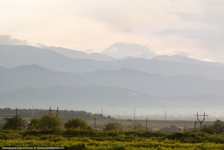 Из-за гор торчит верхушка Эльбруса