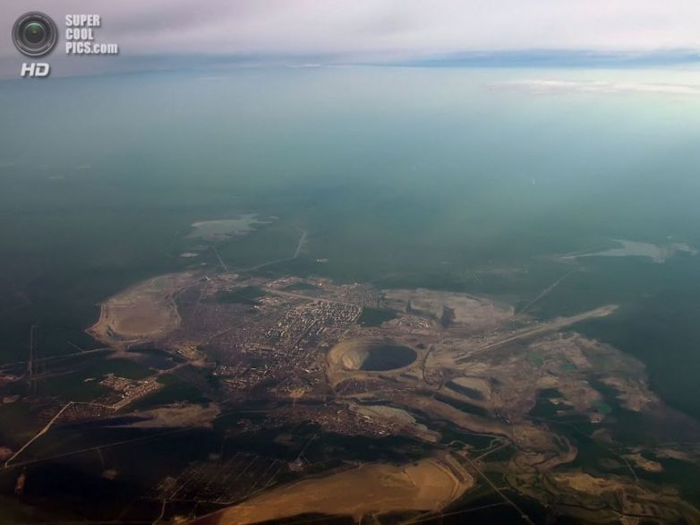 Россия. Мирный, Республика Саха. Отработанный алмазный карьер — один из самых больших в мире — Мирнинского горно-обогатительного комбината. Был открыт в 1957 году и закрыт в 2001-м. Сейчас добыча алмазов ведётся на подземном руднике.