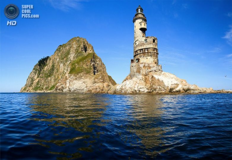 Россия. Анива, Сахалинская область. Маяк на скале Сивучьей. Был построен в 1939 году по проекту японского архитектора Миуры Синобу. На цокольном этаже маяка располагались дизельная и аккумуляторная; первый этаж с пристройкой занимали кухня и продовольственный склад, второй — радиорубка, аппаратная и вахтенная. На третьем, четвертом и пятом этажах были жилые комнаты, рассчитанные на 12 человек.
