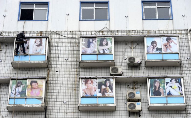 14. Окна банного комплекса в провинции Хунань, обклеенные фотографиями из интернета, 10 января 2014. Вмешалась городская администрация, ведется демонтаж снимков (всего около 50-ти).