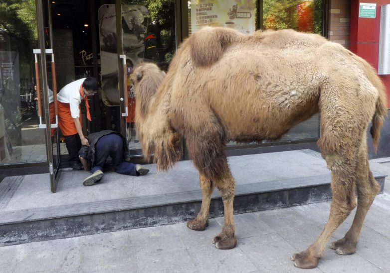 12. Новая тенденция в провинции Чжэцзян — нищие с верблюдами, которые просят милостыню в сфере услуг.