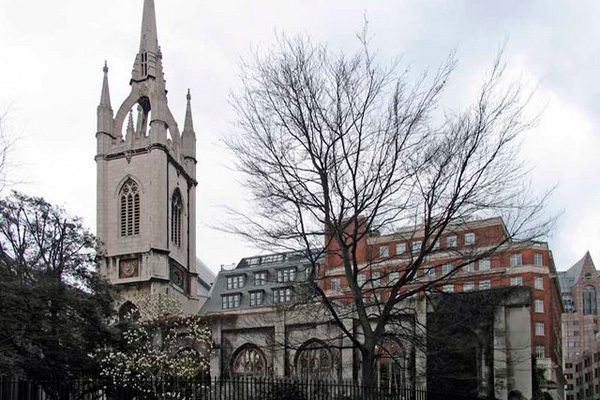 Немецкие бомбежки 1941 года разрушили в Лондоне тысячи зданий и архитектурных шедевров, в том числе и церковь. Самая высокая часть постройки — шпиль — уцелела.
