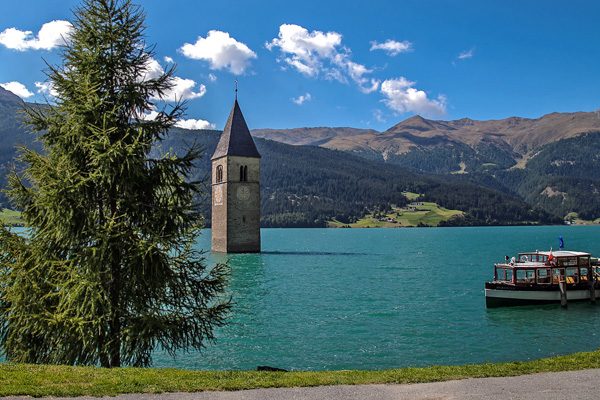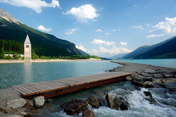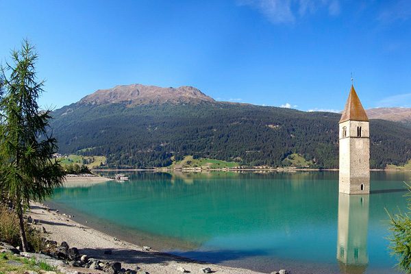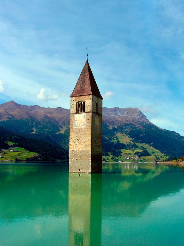 В Италии, как раз на границе со Швейцарией, находится прекрасное озеро Резия. Но известно оно даже не из-за своей живописности, а потому что на нем стоит необычный и странный памятник. Над водной гладью возвышается колокольня.