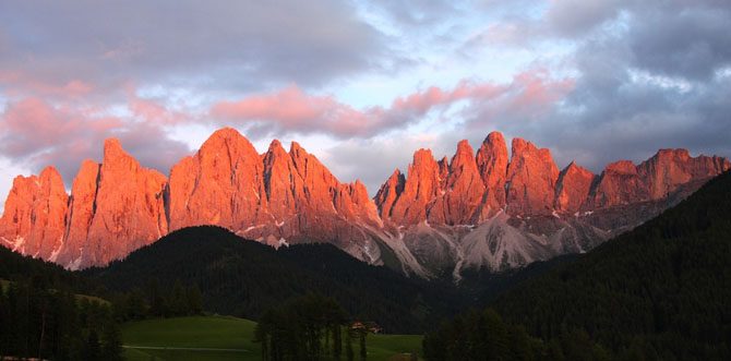 Доломитовые Альпы на северо-востоке Италии имеют уникальное свойство становиться розовыми под лучами заходящего солнца — это явление местные жители называют Энросадира (Enrosadira), что в буквальном переводе означает «стать розовым». Каждый вечер западные склоны гор окрашиваются в различные тёплые тона — от ярко-жёлтого до тёмно-красного или фиолетового.