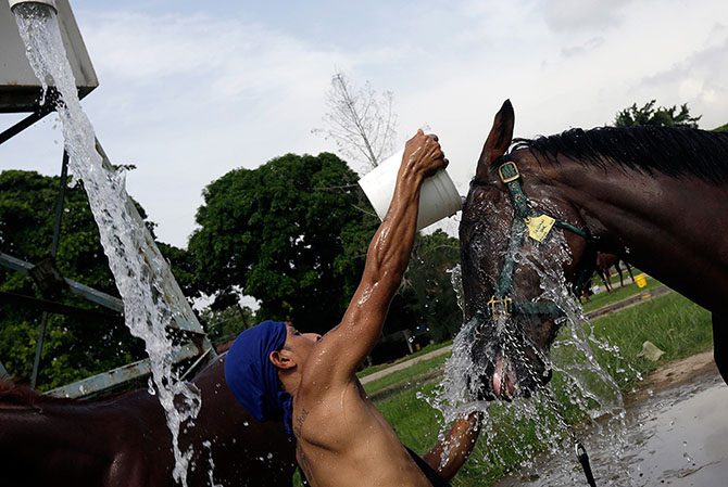 Грум моет лошадь на Ипподроме имени президента Ремона