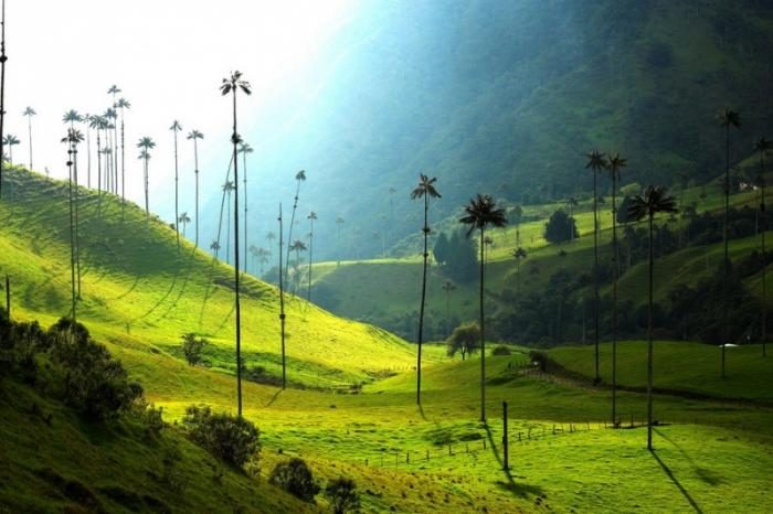 Самые высокие пальмы в мире можно увидеть в колумбийской долине Кокора. Человек выглядит всего лишь крохотной фигуркой на фоне этих огромных деревьев, которые, кажется, достигают самого неба.