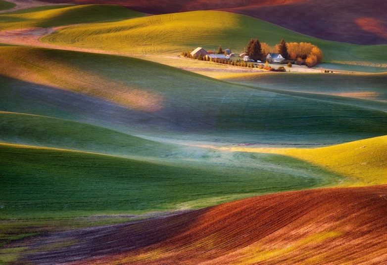 1. «Сияние заката» — разноцветные холмы Palouse ранней весной на закате.