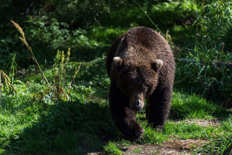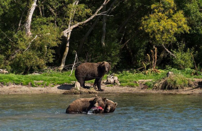 Есть ещё одно место, где «пасутся», в прямом смысле этого слова, медведи. Это в месте, где реку перегораживает мост и где производится учёт проходящей тут нерки. Вода низкая, поэтому медведи вообще не испытывают никаких физических нагрузок. Жира на них столько, что прямо диву даёшься, как они вообще ходят! При виде нас они крайне лениво и неохотно вышли из воды и удалились в лес.