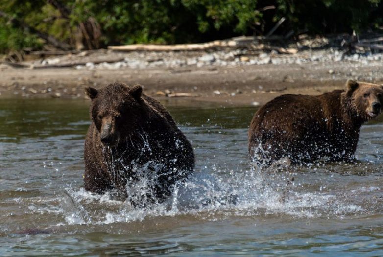 Курильское озеро. 15-20 минут на моторке вдоль берега — и вот они, знаменитые камчатские медведи! Озеро полно рыбы, и два медведя между частым сном и ленивой охотой за неркой играют меж собой. Мы на тихом ходу подошли к ним наверно на 20-15 метров и совершенно спокойно снимали как они играют. Был один момент, когда медведь прыгнул за рыбой в нашу сторону. По жилам дыхнуло холодком, но мы быстро поняли, что объект внимания — не наша лодка, а нерка, и продолжили смотреть на потапычей.