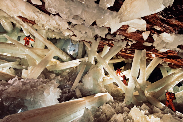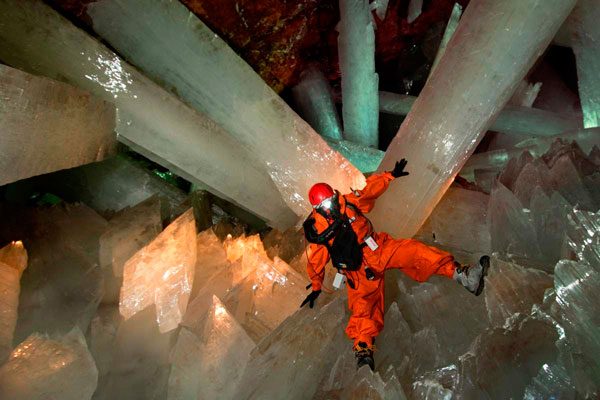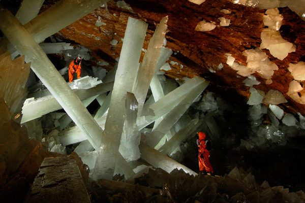 Невероятных размеров и фантастической красоты гипсовые кристаллы, длиной до пятнадцати метров и почти полтора метра в диаметре они сплошь покрывали полость пещеры. Каждый из этих удивительных кристаллов весит около 55 тонн и, по мнению геологов, был образован на стыке термальных (52 градуса Цельсия) и холодных вод, насыщенных сульфидами и кислородом более полумиллиона лет назад.