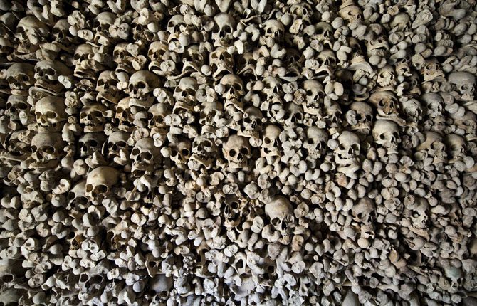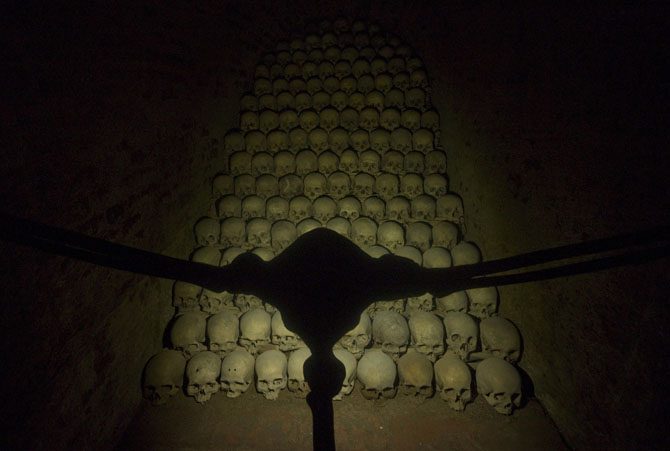 Черепа и кости, сложенные в катакомбах под Парижем, Франция. Общая протяжённость катакомб Парижа по разным данным — от 187 до 300 километров. С конца XVIII века в катакомбах покоятся останки почти шести миллионов человек.