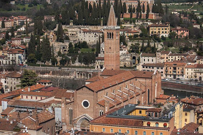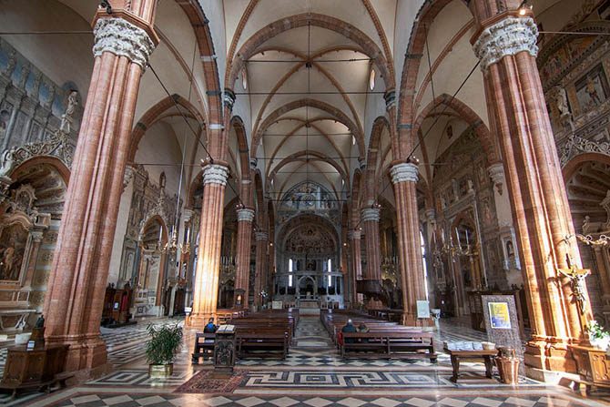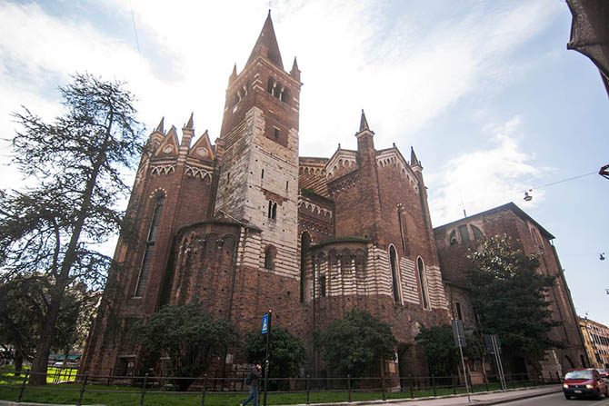 И, наконец, последний из четырех и самый крупный собор Вероны — Сант’Анастасья. Этот собор изначально строили в готическом стиле, с XIII по XIV вв. Церковь строилась одновременно с Занниполо в Венеции, их фасады очень похожи.