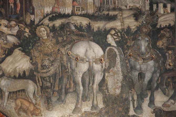 На фреске изображен Георгий Победоносец перед его отправлением для сражения со змием (змий в левой части фрески, сохранился лишь частично). Справа от святого стоит принцесса Трапезунда, которую как раз пришел черед отдавать змею на съедение. Обратите внимание на лошадок, вы видели ещё хотя бы одну картину или фреску того периода (XV в.) с такими ракурсами?
