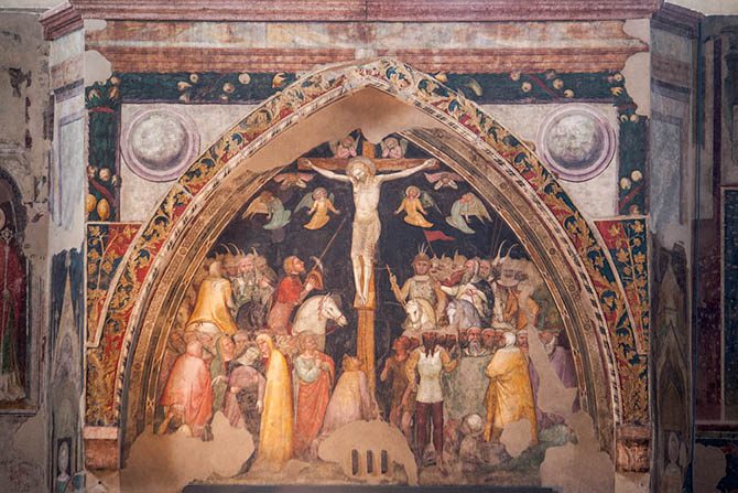 На контрфасаде, прямо над входным порталом, видна фреска XIV в. «Распятие» — шедевр Туроне ди Максио, учителя Альтикьеро да Дзевио.
