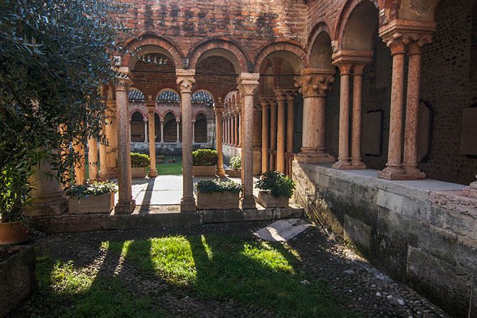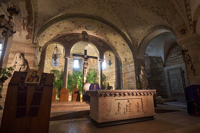 Примечательна она тем, что в конце XX в. здесь провели археологические раскопки и обнаружили фундамент и мозаичный пол алтаря и пресвитерия самого первого храма Вероны IV в.(!)
