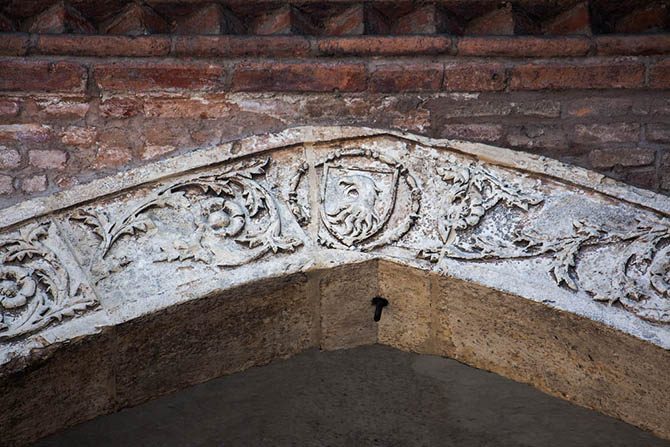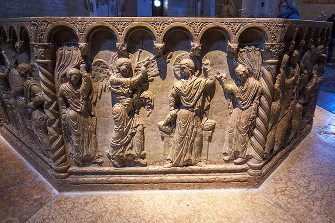 Главное, на что тут стоит обратить внимание — восьмигранная купель конца XII в., вырезанная из единого куска красного веронского мрамора мастером Бриолото.