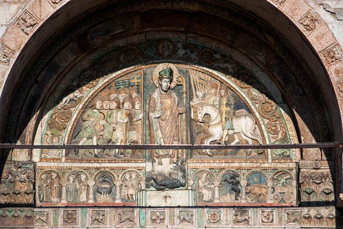 Портал выглядит гораздо более навороченным, чем портал Дуомо за счет 18 боковых панелей. Сюжеты, в основном, библейские, но есть также легендарные и бытовые, посвященные жизни Теодориха Великого. Те, что справа — работа того же мастера Никколо.