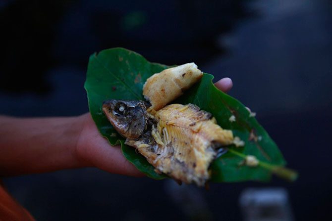 Мальчик держит на листе печеную рыбу. Ologa — деревня на западе Венесуэлы — место тысячи молний.