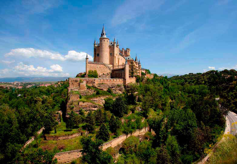 Жемчужина Испании – замок Segovia, расположенный в романтическом уголке в окружении удивительных пейзажей, признан историческим мировым наследием. Сооруженный в начале 12-го столетия, замковый комплекс время от времени достраивался многими королевскими династиями. И сегодня замок представляет собой причудливое сооружение с многообразием архитектурных стилей. Совершенство этого величественного укрепления довершают элегантные башенки, конические башни, впечатляющие рвы и умиротворенные внутренние дворы. Оно успело побывать и главной королевской резиденцией, и тюрьмой, и артиллерийской академией.