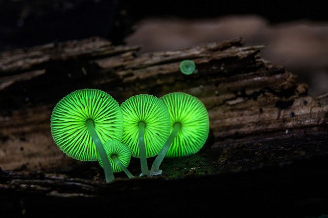 Находясь в лесах Шри-Ланки, Японии, Тайваня, Австралии, Бразилии, Полинезии, или Явы, можно подумать, что вы попали в страну чудес, и всё благодаря грибам Mycena chlorophos.
