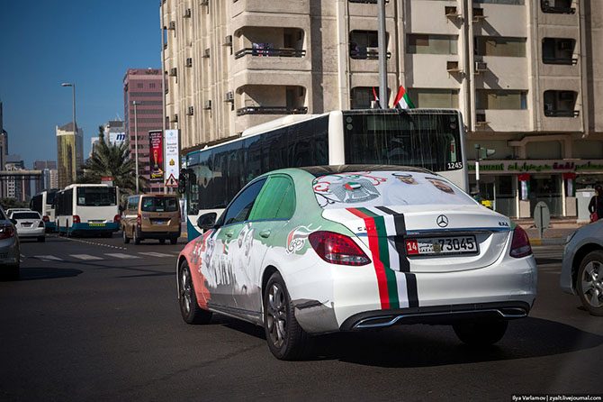 2 декабря Эмираты празднуют день независимости от Великобритании. В этом году было 43 года. В честь этого знаменательного события у местного населения наблюдается небывалый прилив патриотизма. Все машины раскрашивают в цвета флага и лепят везде портреты шейхов.