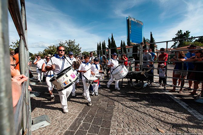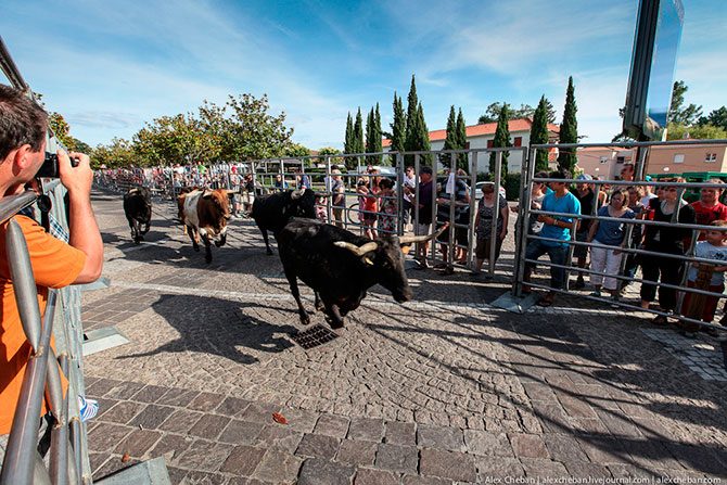 По пути в какой-то транзитной деревеньке встретили забег быков за мужиками, по-другому я это обозначить не могу. Все мероприятие продолжалось минут 30, сначала прошел оркестр, потом выпустили мужиков и быков, которые несколько раз вяло пробежали друг за другом по металлическому коридору. Все похлопали и разошлись. Экшена не было никакого. Но для деревушки это был большой праздник…