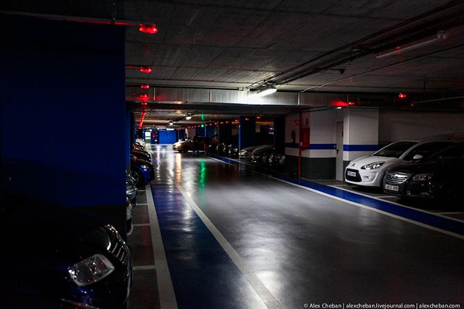 В темном подземном паркинге над каждым местом горит красная или зеленая лампочка. Это очень удобно, заезжаешь в темный подвал и ориентируешься на зеленый свет индикатора: