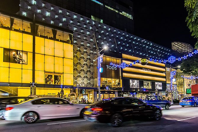 А это подсвеченный множеством лампочек по всему фасаду Orchard Central.