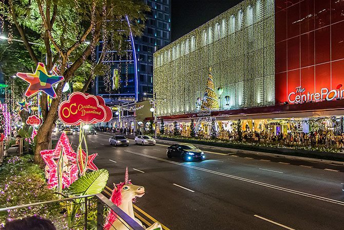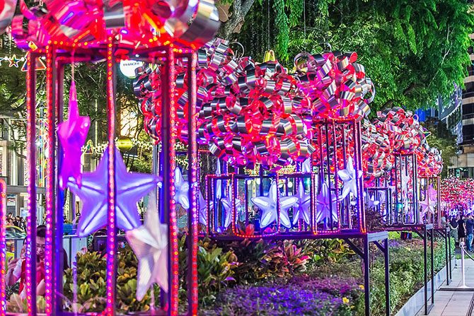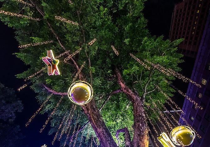 Самая известная, и можно сказать, знаменитая улица Сингапура – Orchard Road. Перед Рождеством каждый шоппинг центр, каждый магазин, выходящий фасадом на улицу, украшается для привлечения покупателей. В этом году красиво, очень “богато”, украшена улица, деревья, столбы и здания.