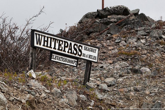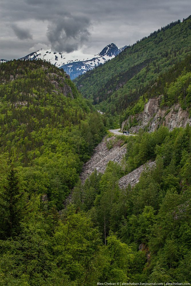 Справа – дорога через перевал White Pass, она была сложнее, но значительно короче. Здесь погибло более 3000 лошадей, поэтому долина называется Dead Horse Valley.