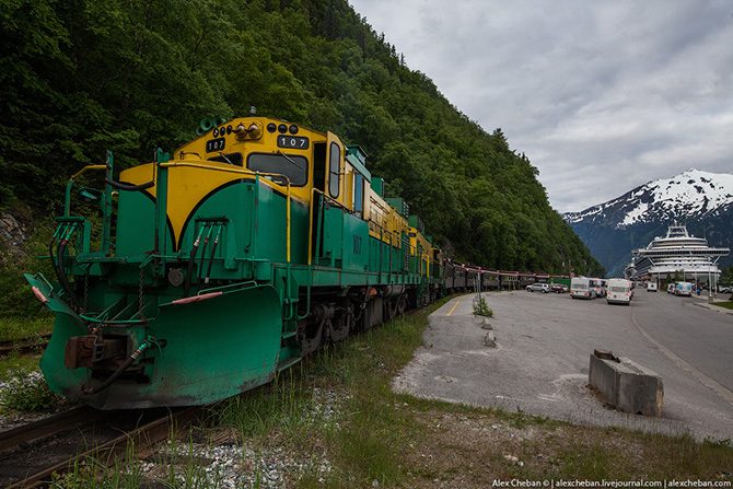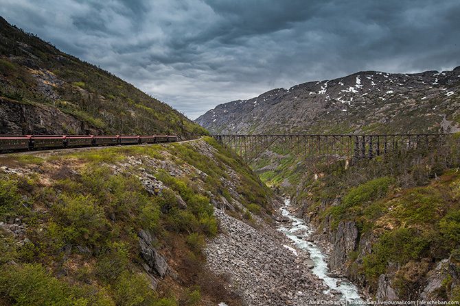 Так появилась White Pass Railways. Самая красивая узкоколейка на Аляске протяженностью 175км. Работы по строительству дороги начались в 1898 году. Трасса проходила по сложному горному перевалу White Pass, но открытие состоялось всего спустя 2 (два) года! Вот, что делает с людьми золото.