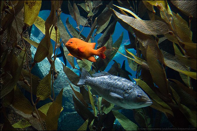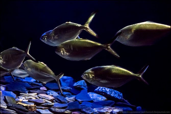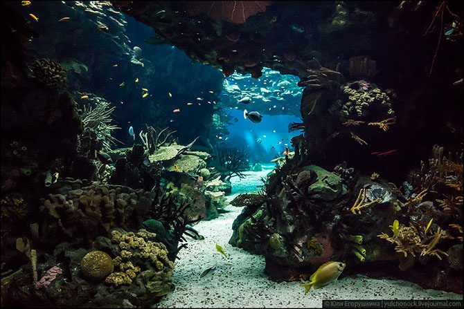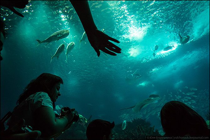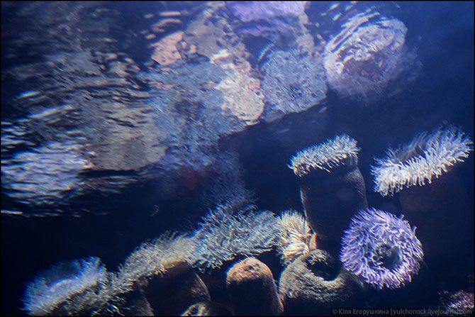 Морские обитатели тоже интересны и очень разнообразны, встречаются странные, забавные и неизвестные науке экземпляры. А пространство по ту сторону стекла совершенно космическое… и очень удачно совмещено с пространством нашего сухопутного мира.
