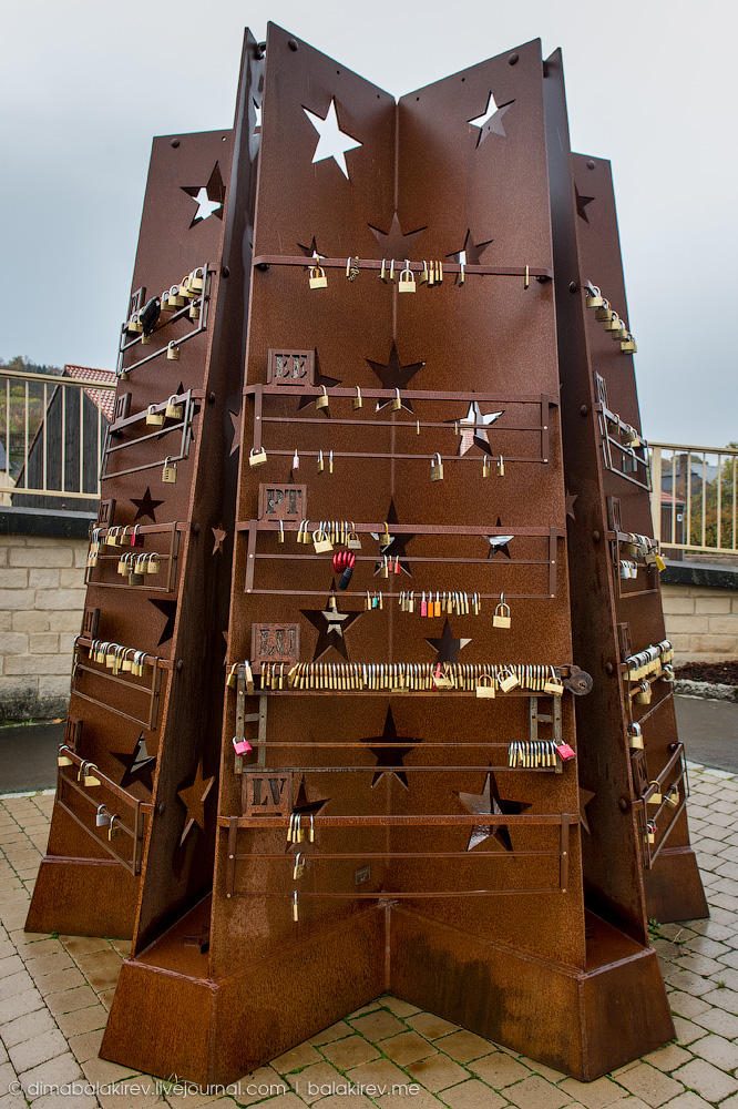 Неподалеку от музея Шенгенского соглашения установлена вот такая ржавеющая стела. Честно говоря, фетиш с вывешиванием замков, где попало, мне порядком поднадоел. Но в случае деревушки – задумка крутая. Приезжает из Германии условный Вася Пупкин, ну, то есть Йохас Мюллер. Покупает в ближайшей сувенирной лавке замок, вешает на решетку своей страны. И как бы доказывает: посмотрите какие мы немцы хорошие, как мы много путешествуем. Не то что эти… румыны.