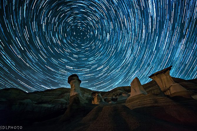Из рассказов блоггера: Для хорошего звездного неба мало иметь безлунную ночь, надо чтобы еще и облаков не было. А с этим у нас сейчас намного сложнее. Наконец пришла осень, принеся с собой пасмурную погоду. Прогноз погоды показывал облака во всех направлениях от Калгари. Какова же была моя радость, когда я увидел, что пятничный прогноз на Драмхеллер поменялся и ночь там ожидалась абсолютно ясная.