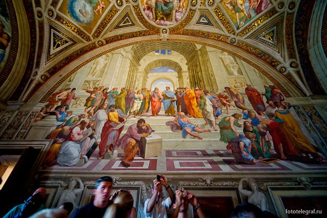 Знаменитая фреска Рафаэля “Афинская школа” с изображением Платона и Аристотеля.