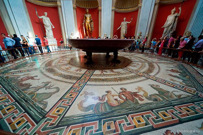 Зал, пол которого украшен великолепной мозаикой, — зал Ротонда. В центре — чаша из Золотого дома императора Нерона.