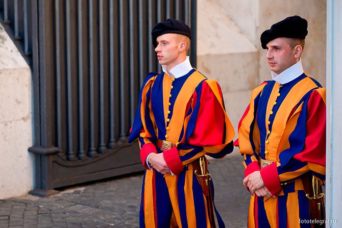 Гвардейцы несут службу на входе в Ватикан (интересно, что не видно знаков воинского различия). Вооруженные силы Ватикана состоят из швейцарской гвардии, которая насчитывает чуть более ста человек. Это самая маленькая армия в мире. В нее принимаются швейцарцы, прошедшие службу у себя на родине, имеющие рекомендации, холостые, ростом от 174 см, католики. Месячное жалованье небольшое – около 1000 евро.
