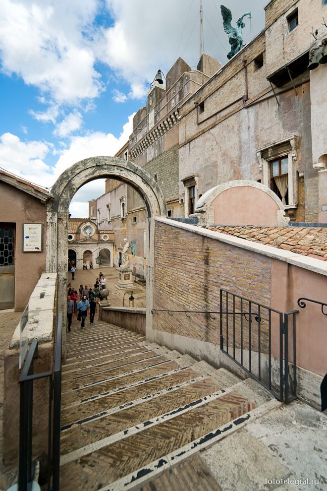 Дворик Ангела со статуей, которая, как раз, и стояла на вершине замка до XVIII века. Она сделана из мрамора и была установлена наверху в XVI веке. От видения папой архангела до установки его статуи прошло всего-то каких-то 1000 лет.