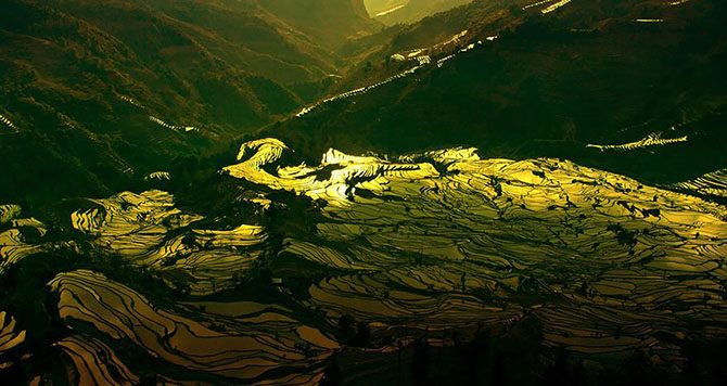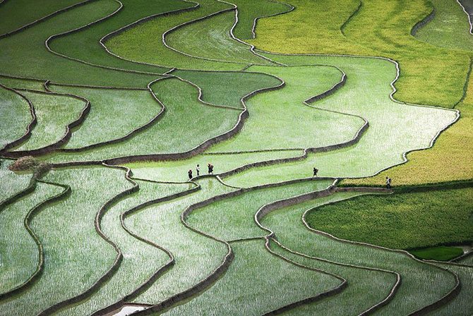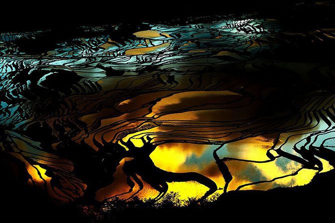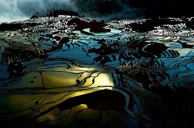 Рис является основным продуктом питания для большей части населения нашей планеты, поэтому неудивительно, что семенами этого растения засеивают огромные территории. И холмистый ландшафт вовсе не является преградой для выращивания риса, превращаясь в потрясающие, невероятно красивые рисовые террасы, с высоты похожие на какую-то инопланетную поверхность… или разбитое зеркало: