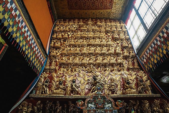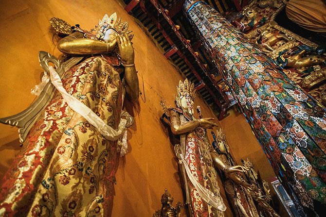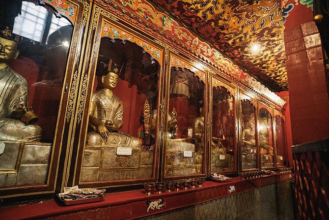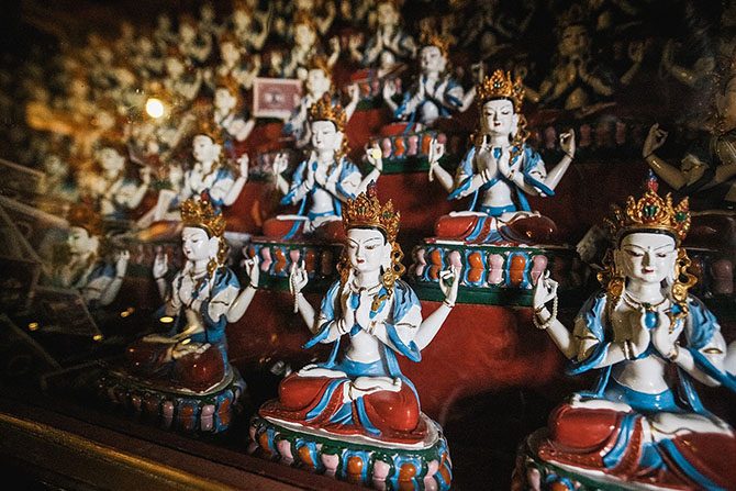 Есть несколько комнат, которые полностью заставлены статуями того или иного будды, например Будды Шакьямуни, Зеленой Тары или, как на фотографии, Авалокитешвары. Этот четырехрукий бодхисаттва является олицетворением сочувствия всех будд.