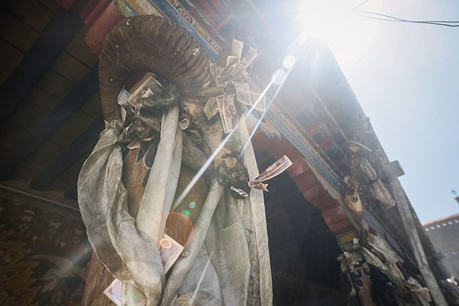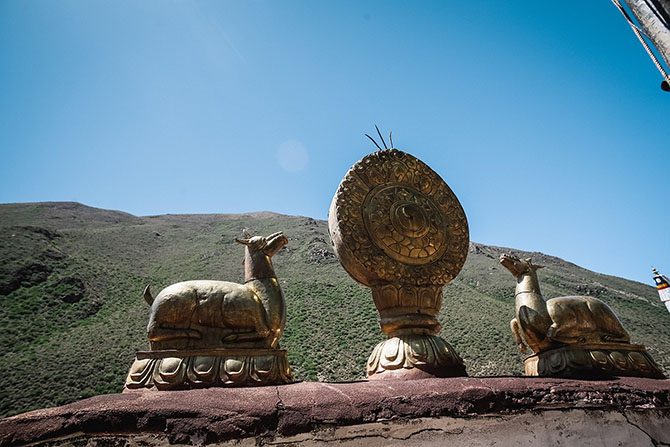 Побродив вместе с тибетскими бабушками по монастырю, мы забрались на крышу, чтобы поближе взглянуть на традиционное украшение — двух оленей и колесо Дхармы. Когда Будда Шакьямуни давал первое учение (или, как говорят буддисты, сделал первый поворот колеса Дхармы), это произошло в Оленьем парке в индийском Сарнатхе. Кроме пяти первых учеников, послушать Будду пришло и двое оленей.