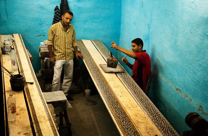 Заглянули в мастерскую, где, как мы поняли, делают оклады для дверей мечети – парень делал инкрустацию из перламутровых частичек морских раковин.