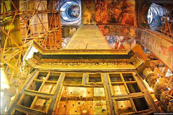 На время ремонта, иконы обернуты бумагой и сложены тут же, неподалеку.