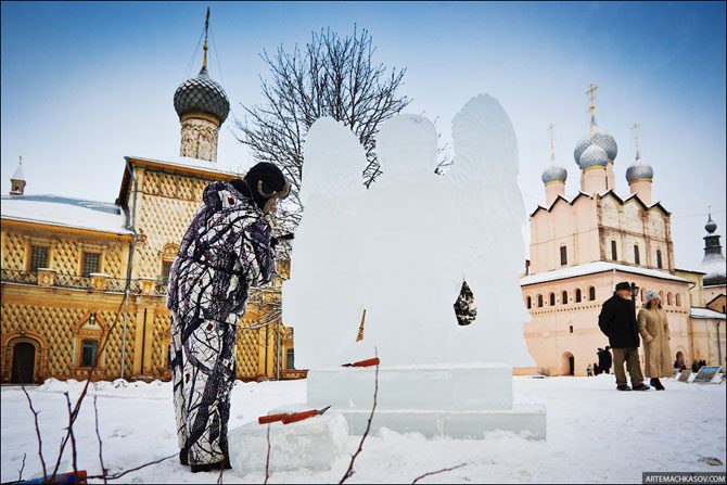 Внутри улыбчивый мастер точит резцом ледяную фигуру архангела.